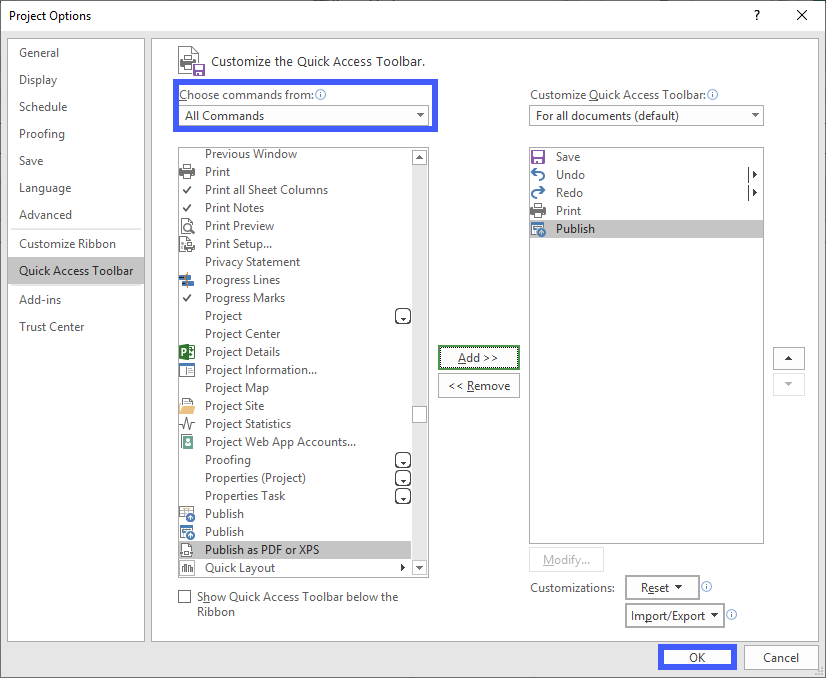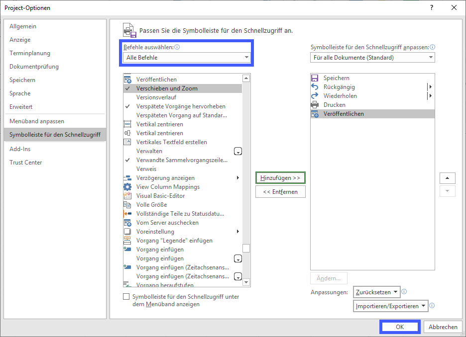 Often, however, commands are missing that can only be started by multiple mouse clicks, such as Print or when using Project Online or Project Server Publish. You can add additional commands you want to the Quick Access Toolbar. To do this, open the Project Options dialog via File - Options. Go to view Quick Access Toolbar. Select the desired command