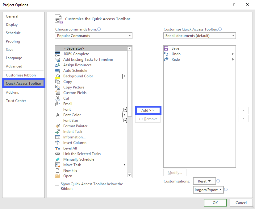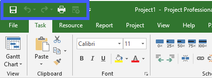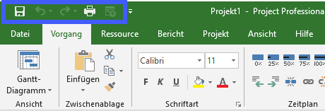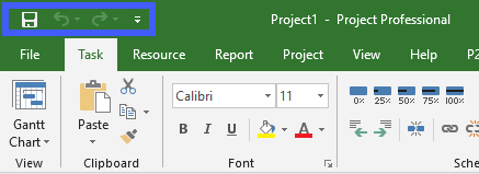 As with all Office applications 2007+, you can customize the Quick Access Toolbar in Project 2010 or later. This makes it very convenient to provide commands that you need frequently for easy access. Without adjustment, the commands Save, Undo, and Redo are available.
