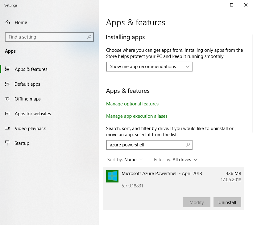 If you installed the Azure PowerShell AzureRM modules on your computer using the MSI package, you must uninstall through the Windows system rather than PowerShell in Start / Settings / Apps (or with CTRL + X, Aps and Features). See more at Uninstall the Azure PowerShell module.