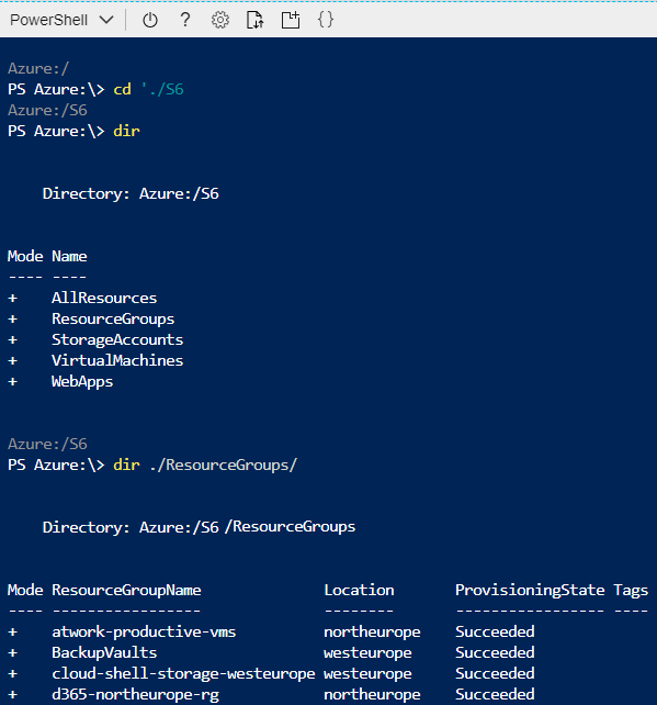work… (flashback from my Unix time). Anyway, to enter subscription “S6” and then to list the Resource groups, this works very straight forward…