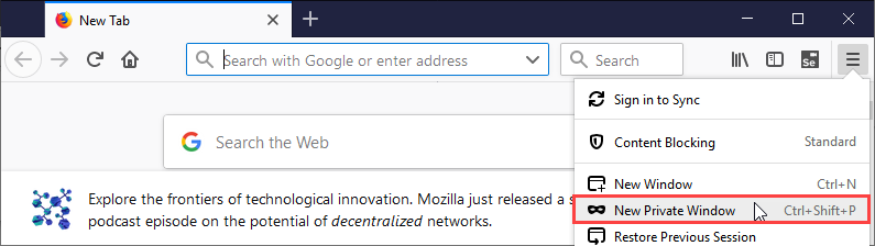 In Mozilla Firefox, press Ctrl + Shift + P, or open the menu “New Private Window” as here.