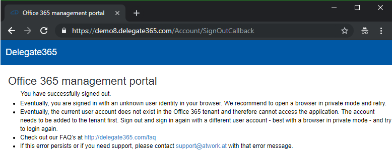 Please follow the steps above if you encounter any issues with your login to the Delegate365 portal. Use a browser in private mode, check your Office 365 account and ask your Delegate365 Portal Admin to check your account in the list of the Delegate365 administrators. In most cases, any issue is a (browser) client topic that can be resolved as described.