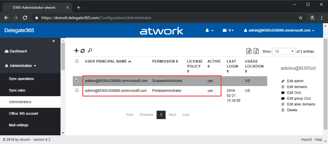 So, if your login still does not work, please contact your Delegate365 Portal Admin to check if your account has been added to the Administrators list in Delegate365. A Portal Admin needs to open the Administration / Administrators menu and see if the desired account is in that list and active: