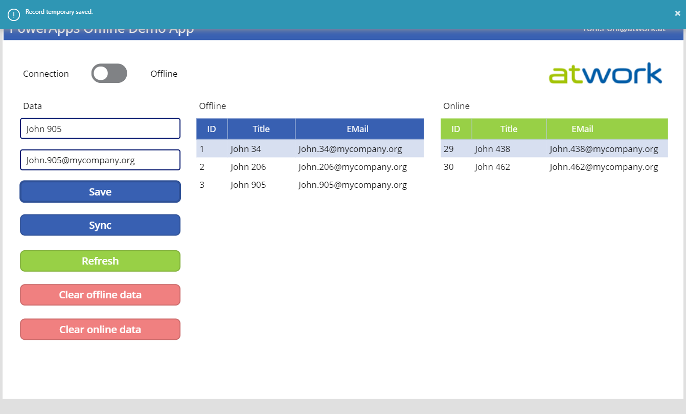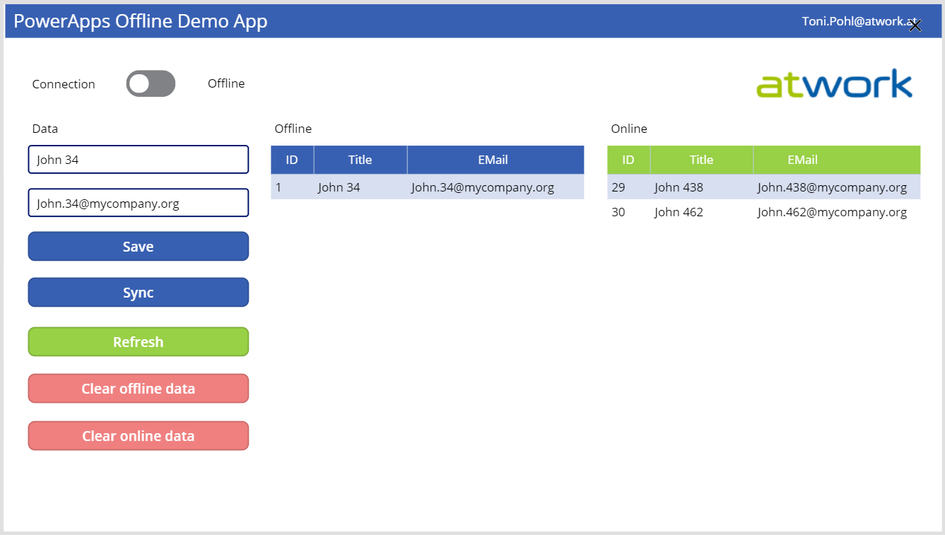 To show the basic functionality, I developed the following, colorful demo PowerApp. The app consists of one screen in tablet mode including a connection toggle control, two input fields for a name and an email address, two data tables and some buttons. The goal is to read and write data in offline and online mode.