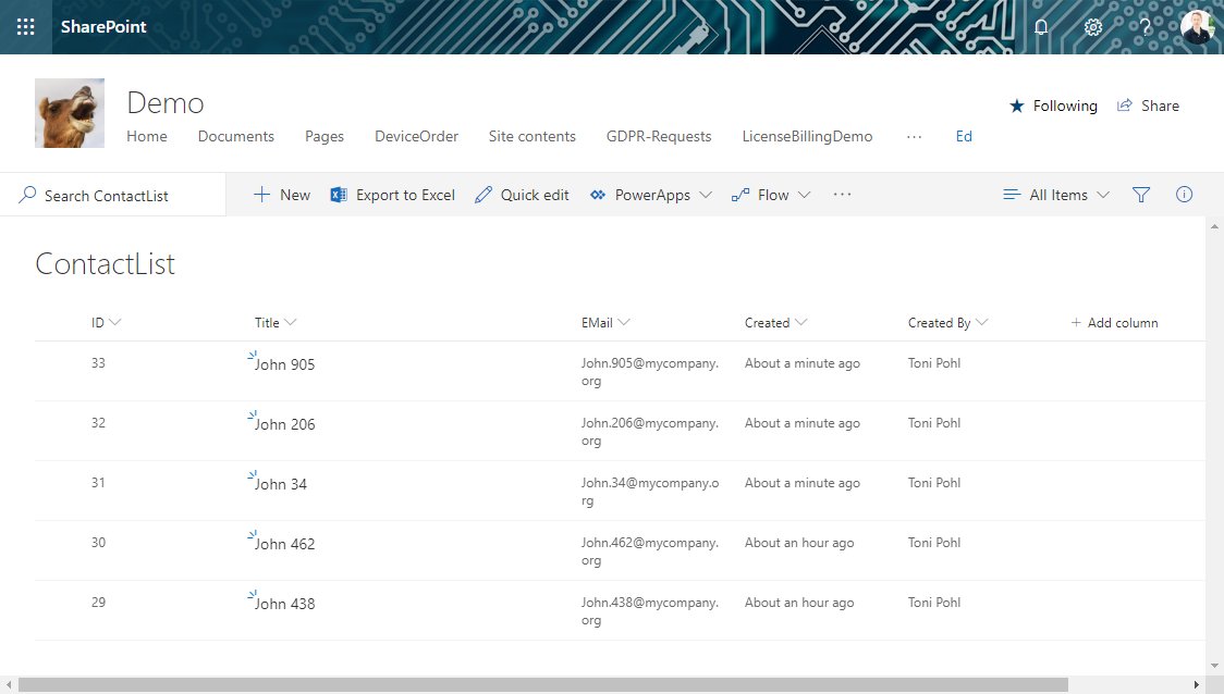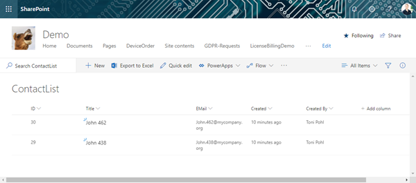 My online data source is a Custom List named ContactList in SharePoint Online (https://mycompany.sharepoint.com/sites/Demo/Lists/ContactList/AllItems.aspx), which has just two columns: Title and EMail.