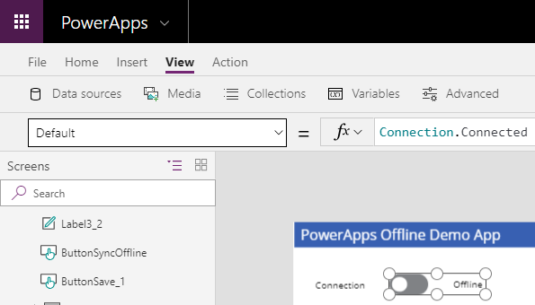 First, I created a new (blank) PowerApp and added some controls as shown in the screen above. To see the connection status and to play around, the first control is a connection toggle. In the Default property, I added