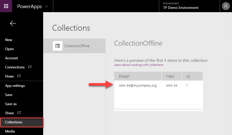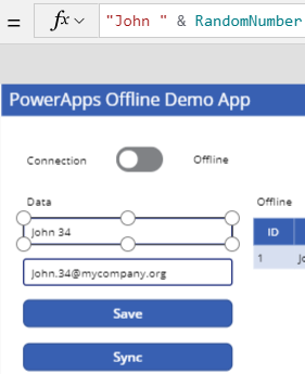 Each time, the Save button is clicked, the both fields get a random name and email address. This saves time for testing, no manual input is required for different data. But we´re not done. First, we implement the “offline” functionality by using a collection to store our values temporary. So, the following code is added after the Set() command, don´t forget the first semicolon: