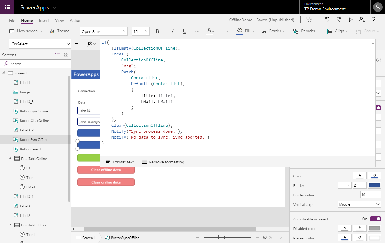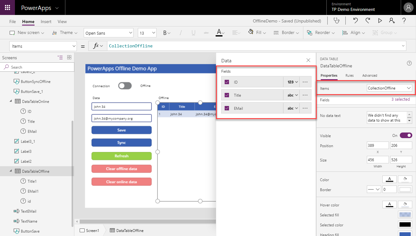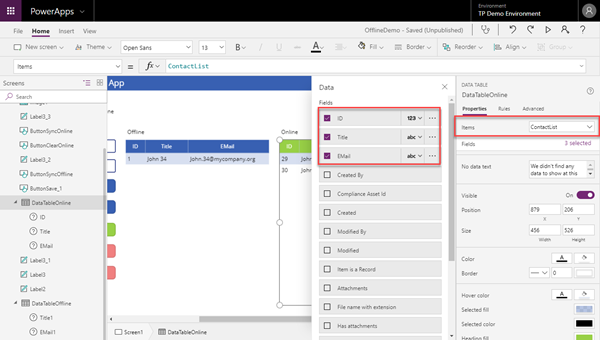 The blue list should display our “offline” data: Data that is entered when offline. So, our CollectionOffline object as Items property and select all three fields. The blue list now shows our generated data - that´s our offline scenario.
