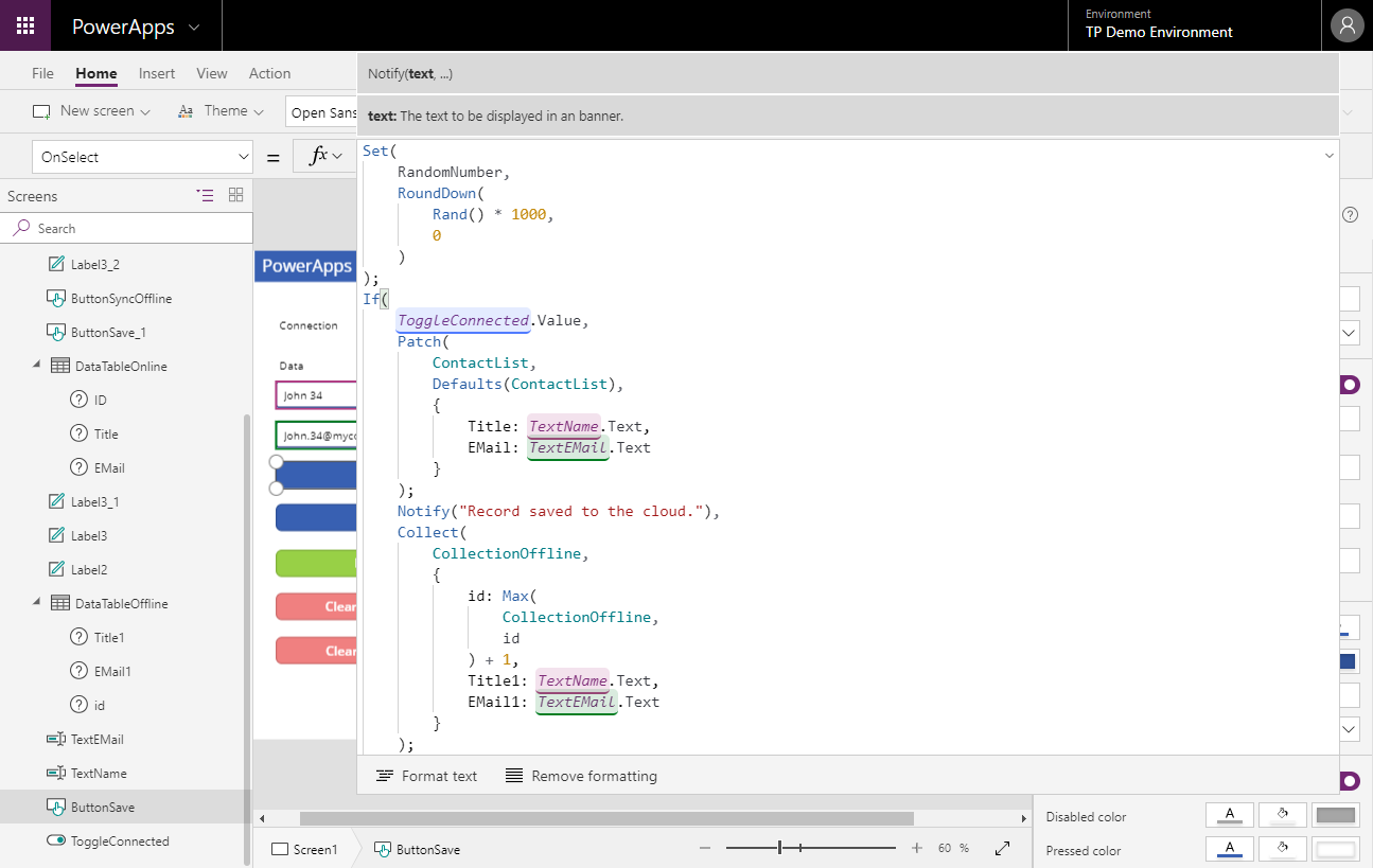 The collection is named CollectionOffline and a generated ID and the text values of the input-controls TextName and TextEMail (pls. use your own control names as Inputtext1, etc.) are added to that collection. Then, a notification is shown. Now, you should run the app and click the Save button multiple times to generate data in that collection. You can check the values in the Files / Collections menu.