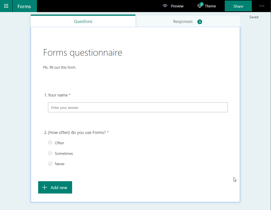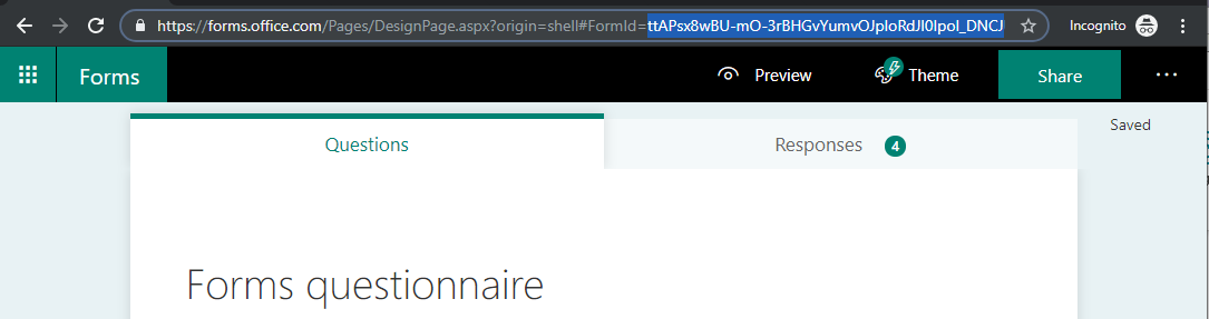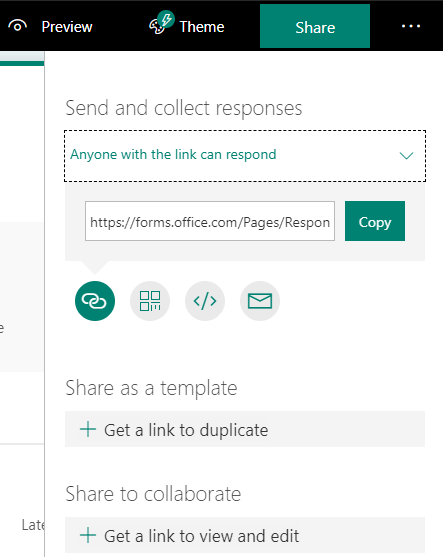 …is as simple as designing: Click on “Share” and copy the generated link (or mail it directly or use the embed form code, etc.). The Share-link looks like this: https://forms.office.com/Pages/ResponsePage.aspx?id=[form-id]