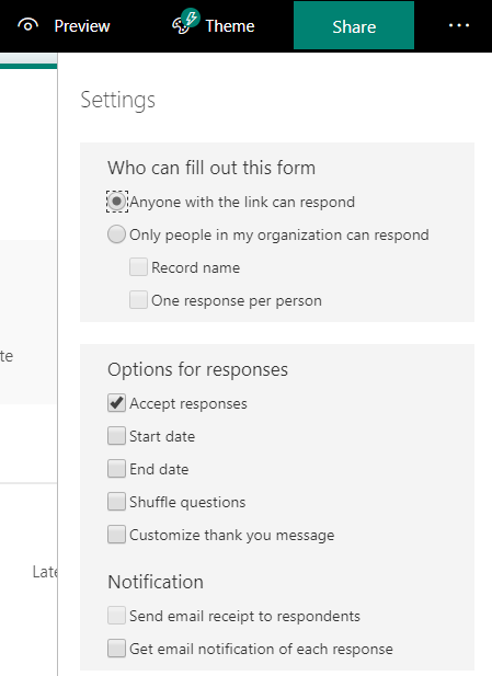 In the “…” Settings menu, you can define if this form can be used by anyone who receives the Share-link, or by authenticated users in your Office 365 tenant only. The default is set to “Only people in my organization can respond”, so, remember to change it if necessary.