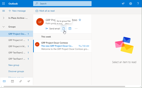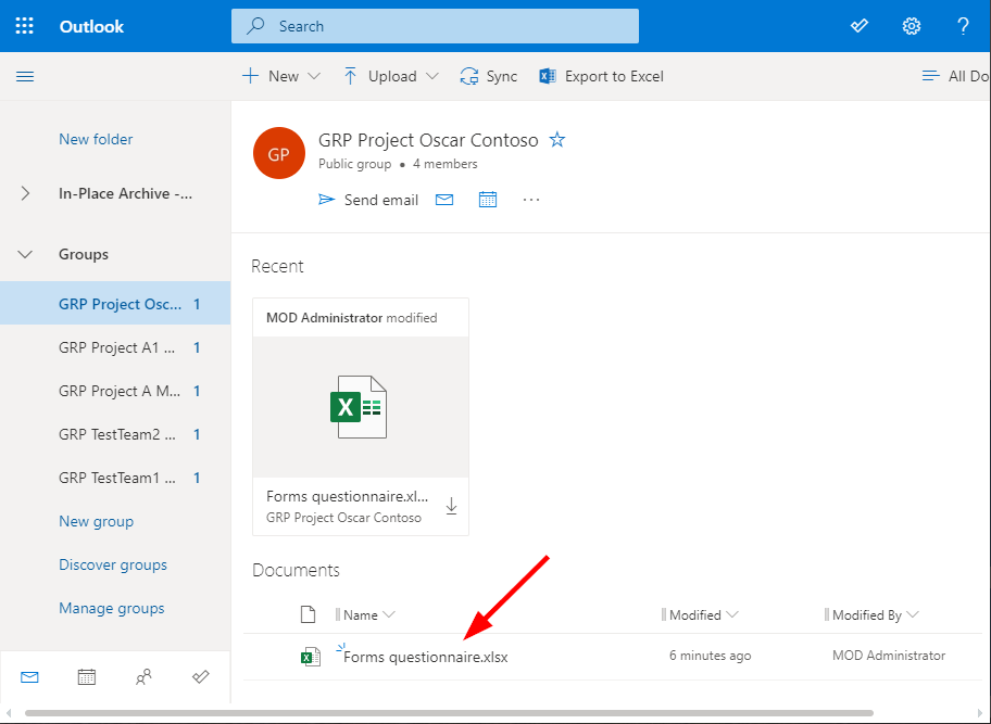 Now comes a mostly unknown feature: When a form is stored in an Office 365 group, the result file is moved to the files of that group! So, the Excel file can be directly accessed in the group files. Here, we see the group in Outlook for the Web and open the files of that group that are existing in SharePoint Online.