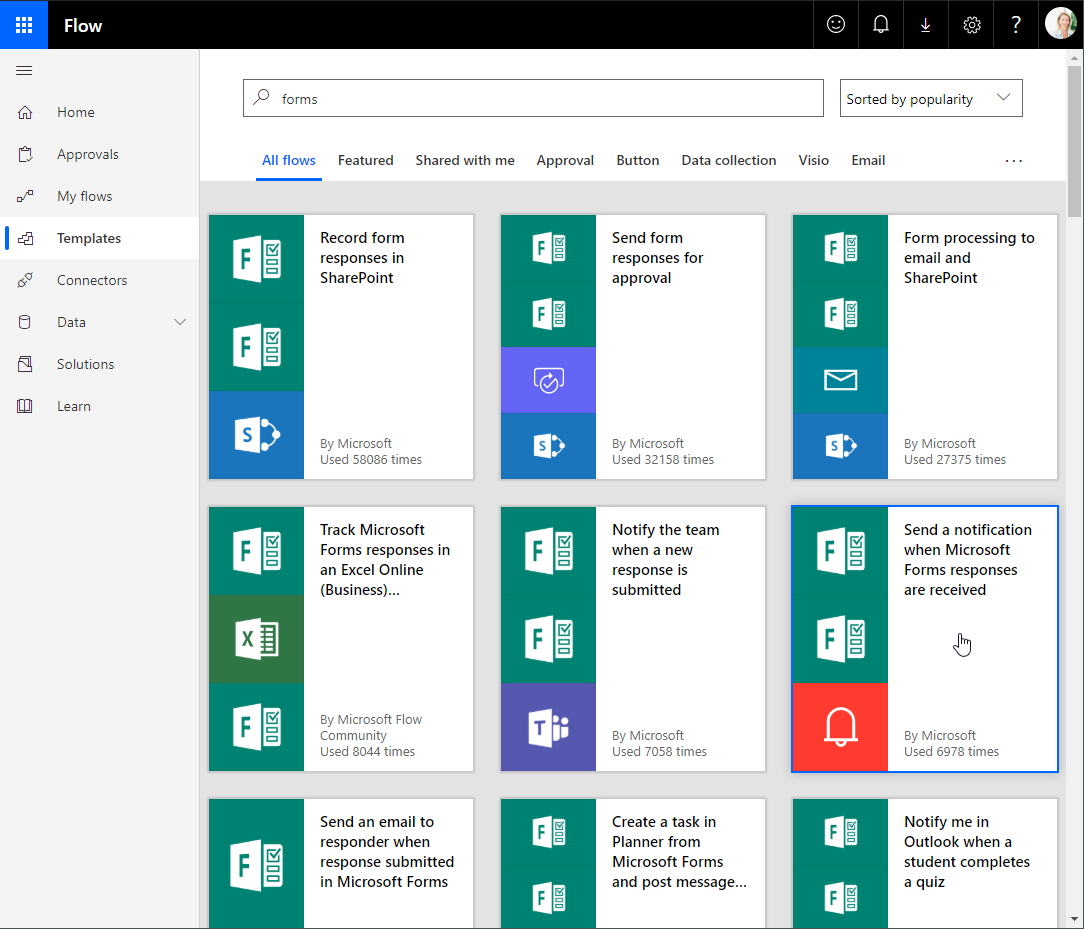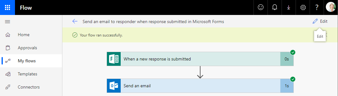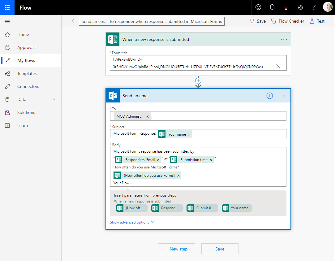 For example, select the “Send an email to responder when response submitted in Microsoft Forms” template. Authenticate if necessary and continue. Flow generates the necessary steps out of the template.