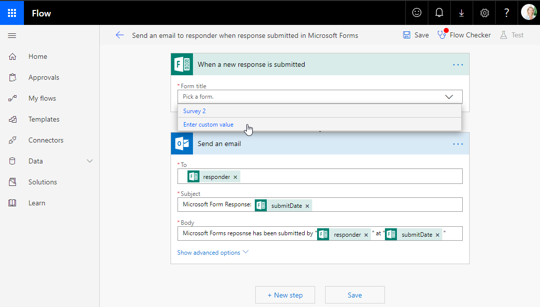 Now use that form ID in the Flow by selecting “Enter custom value” and then paste the form ID… and customize the email and actions as required.