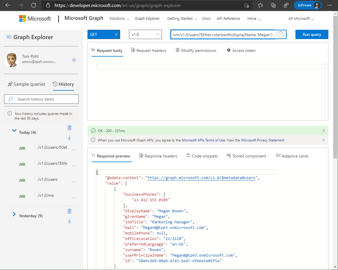 We see the standard user properties (and can select more with the $select OData query parameters). See more about the Graph OData parameters at OData system query options. So far so good.