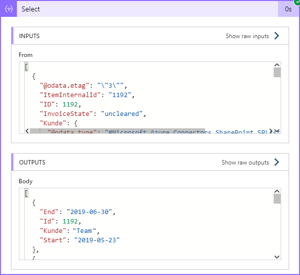 Data Operations - Select is to build our own result set. Since SPO delivers all fields of the custom list, we want to reduce the data to get only the relevant data we need. The Get items query delivers the results as JSON object and the Select operation allows us to access specific data as here.