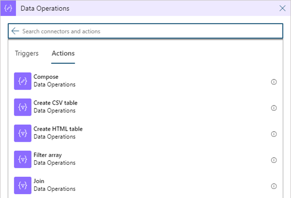 The data is reduced to a smaller set of fields. Also, we could transform data or add similar simple operations like combining fields, etc. Here it´s a simple mapping.The final Data Operation is Create HTML table. There are more useful actions available, e.g. Join to create a string out of the JSON data, or Create CSV table etc.