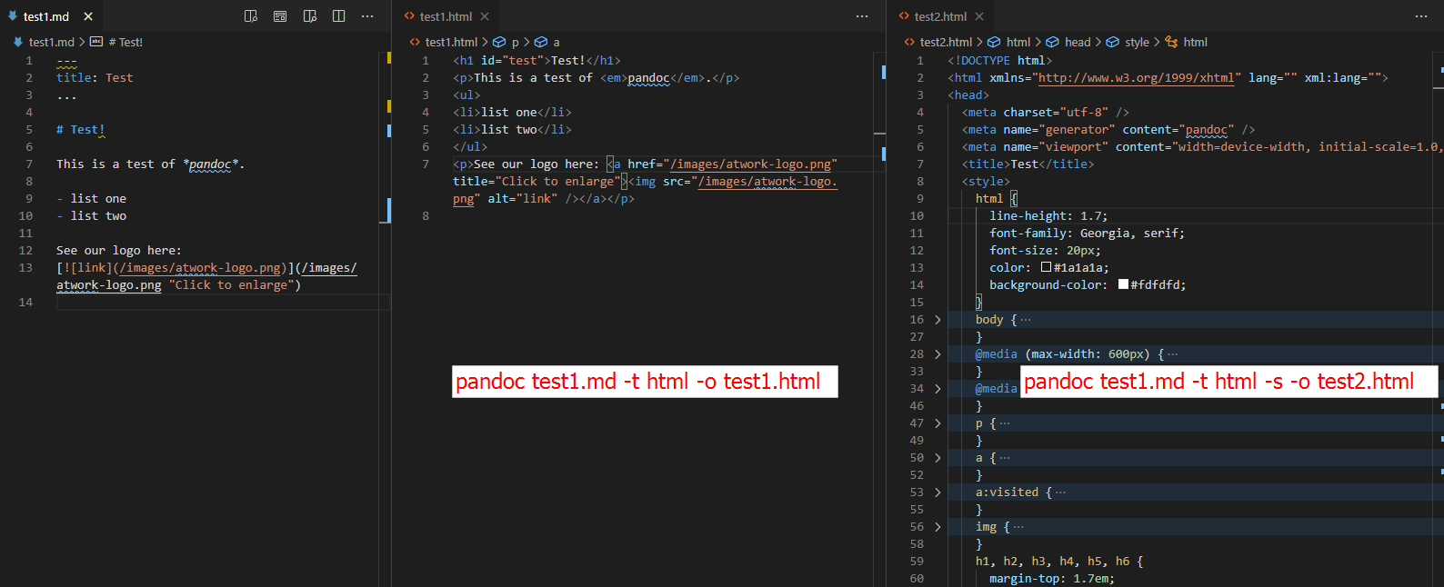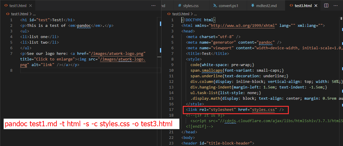pandoc test1.md -t html -s -c styles.css -o test3.html