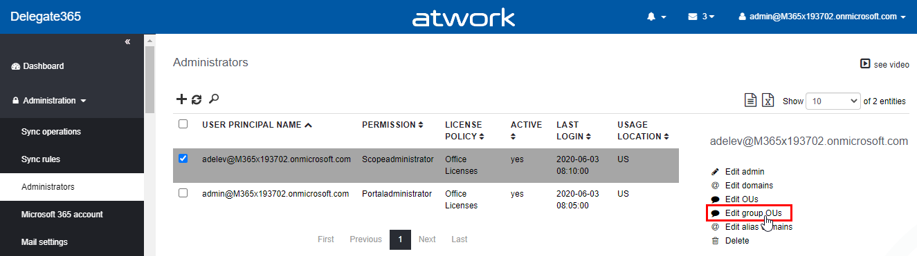 Note: Article Delegate365 changelog version 8.0-Group OU’s also describes the basic concept of Group OU´s in Delegate365. This article describes the modification that the user´s domain must no longer be assigned to an administrator.