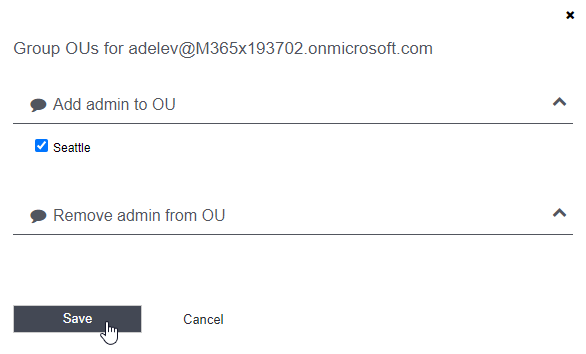 The goal is that Adele can add or remove users from another OU - from Seattle - to her groups. For this purpose there is the concept of the Group OUs. We can assign Seattle as Group OU to Adele as here.