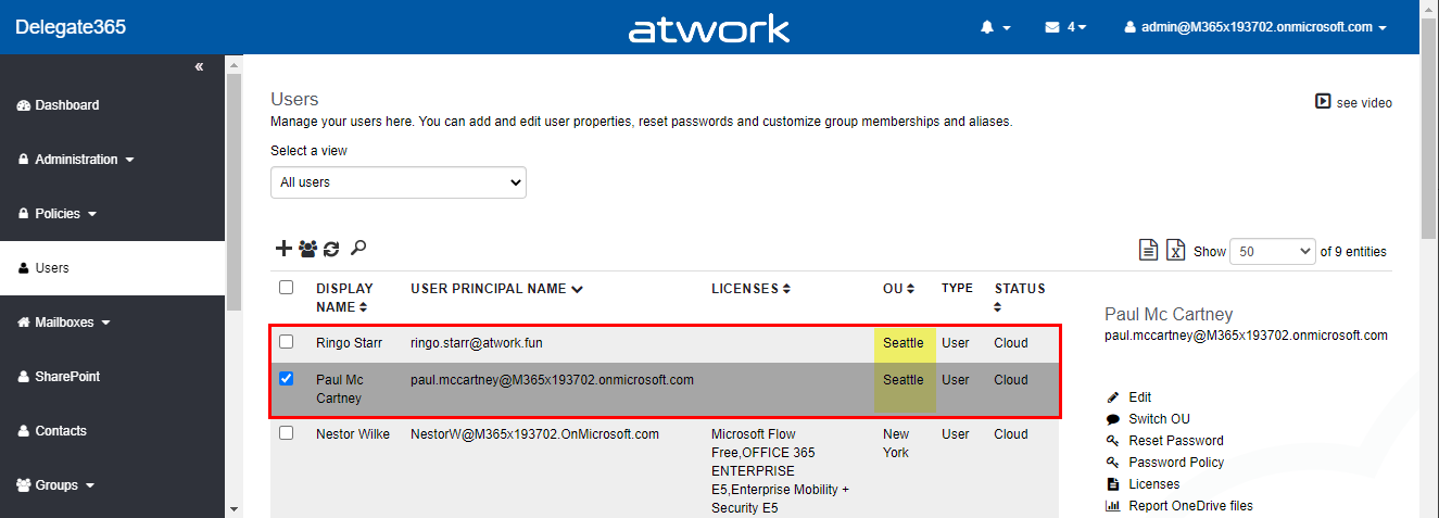 The admin sees *Seattle *and New York. In Seattle, we see two users with two different domains assigned: