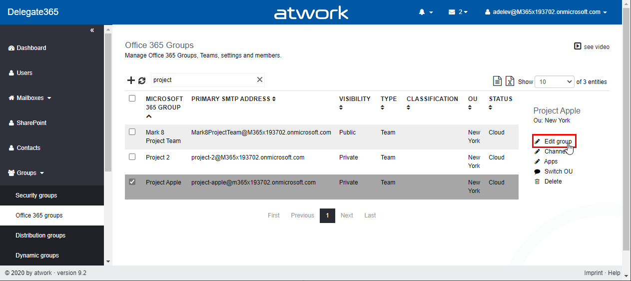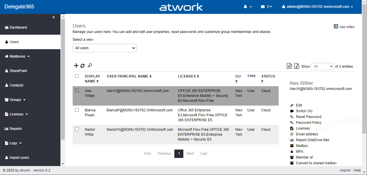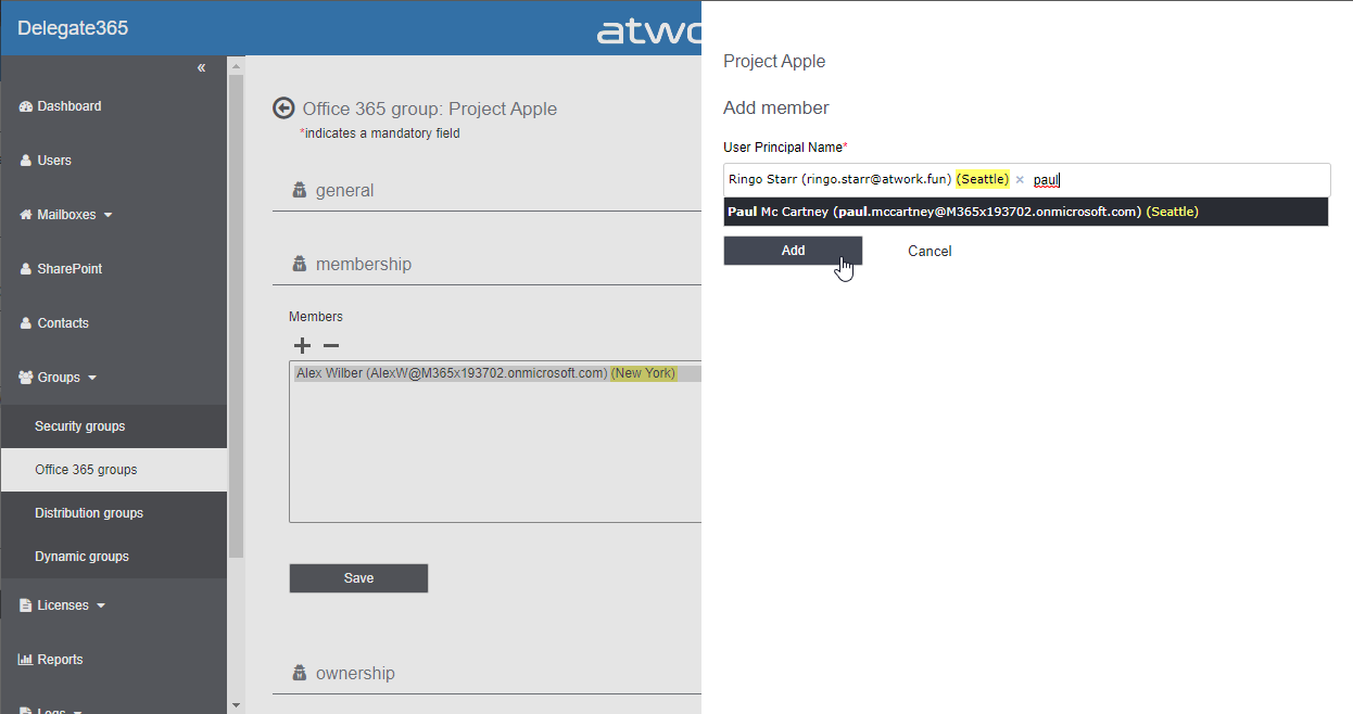 It is worth mentioning here - in contrast to above - that Adele only sees users from her assigned OU´s if the user´s domain name is in the list of her assigned domains as before. Adele is able to add only “her” three users she sees in her users list above. If there are users assigned to New York, but with a different domain name (@atwork.fun in our sample), she would not see them in the people picker.