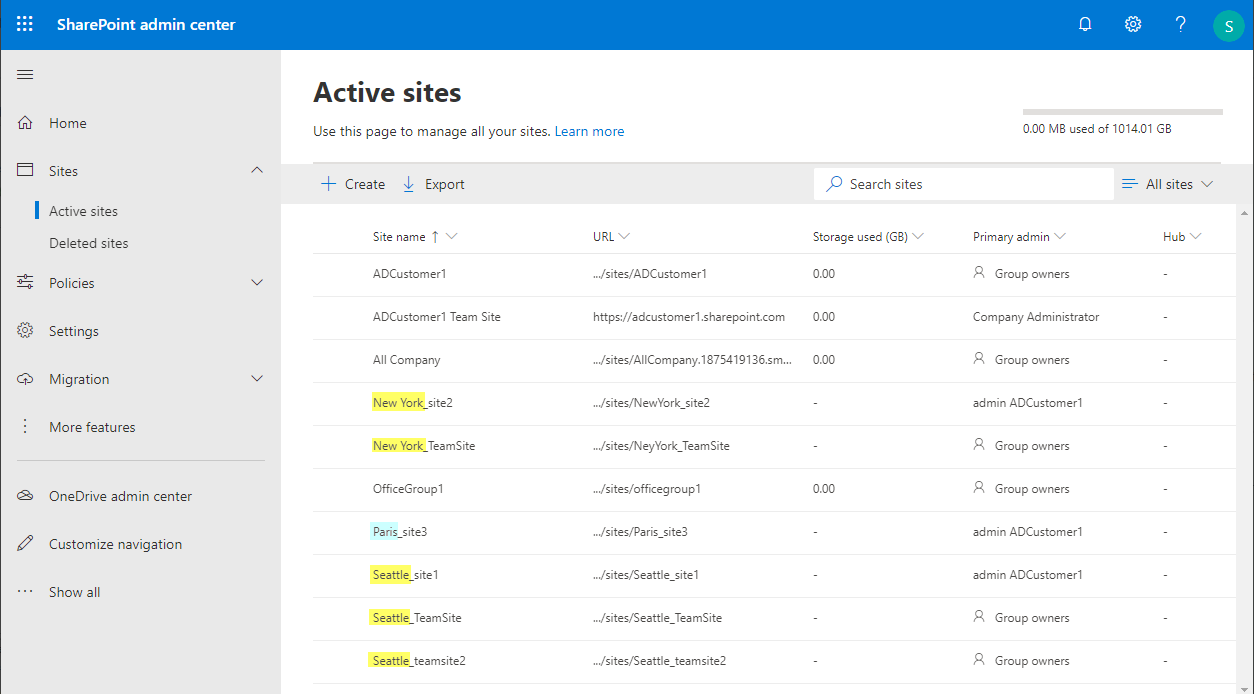 In this demo tenant, there are some SharePoint Online sites with a prefix in their site name: There are two sites starting with “New York”, one site with “Paris” and three sites starting with “Seattle”. All site names are separated with an underscore between OU name and the following site name, as here in screenshot of the SharePoint admin center (open it with your tenant-name and a Admin at https://[yourtenant]-admin.sharepoint.com/).