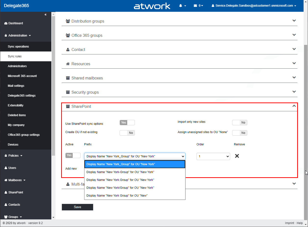 In Delegate365 v9.2, there´s a new section SharePoint in the Administration / Sync rules. Here, Admins can define that SPO sites with an OU as prefix are automatically assigned to that OU, as here.