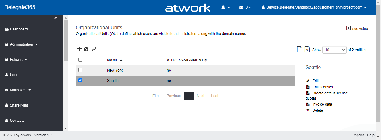 We want to have the new SPO sites automatically assigned to our OU´s. In our sample, we have only two OU´s defined, *New York *and Seattle.