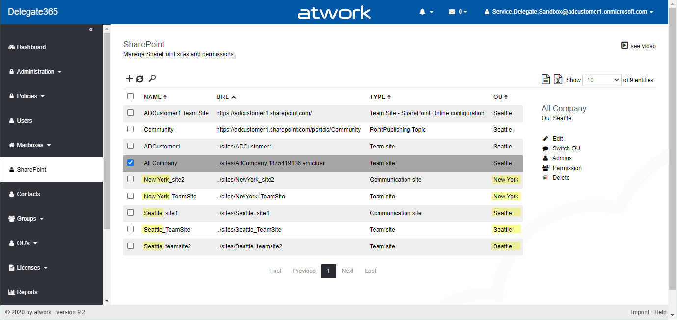 After the SPO sync is completed, let´s see the result. The SPO sites with the prefix *New York *and Seattle should have been automatically assigned to the corresponding OU´s.