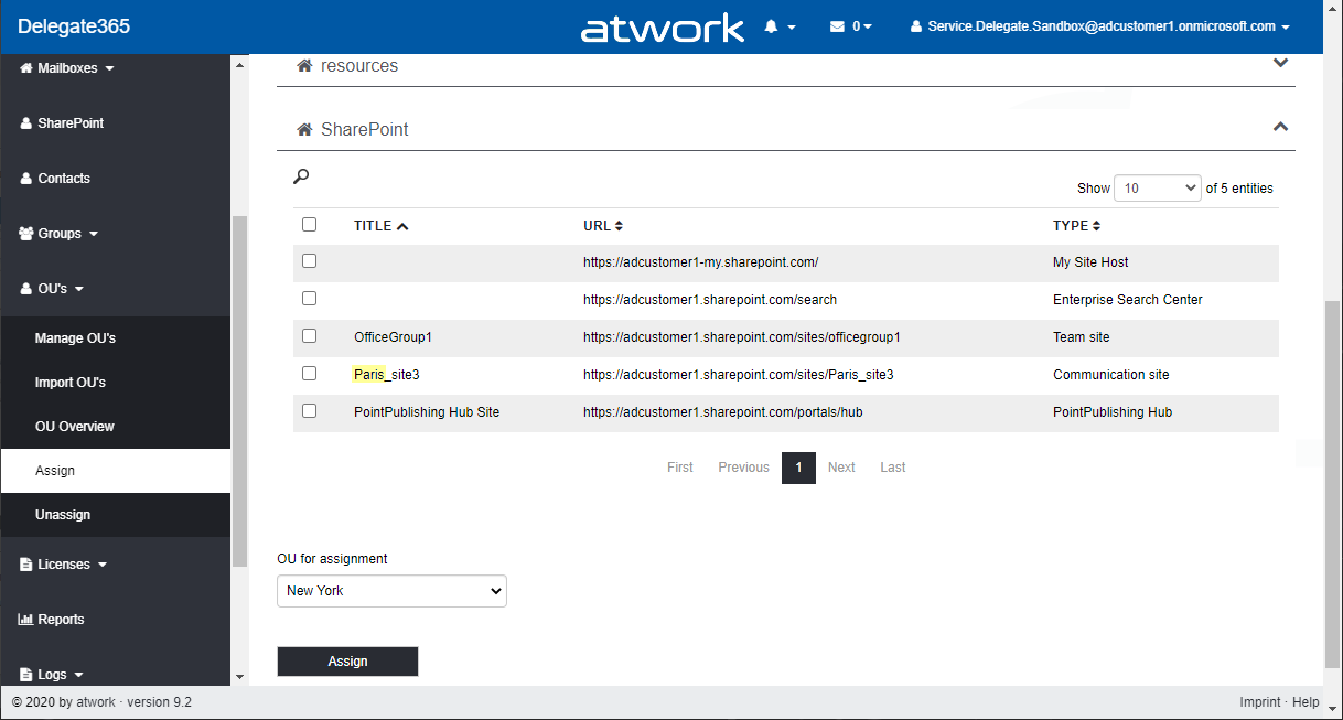 Since there is no OU with the name Paris, this SPO site has not been automatically assigned. This site Paris_site3 show up in the OU´s / Assign module in the SharePoint section and can be manually assigned to an OU (as before).