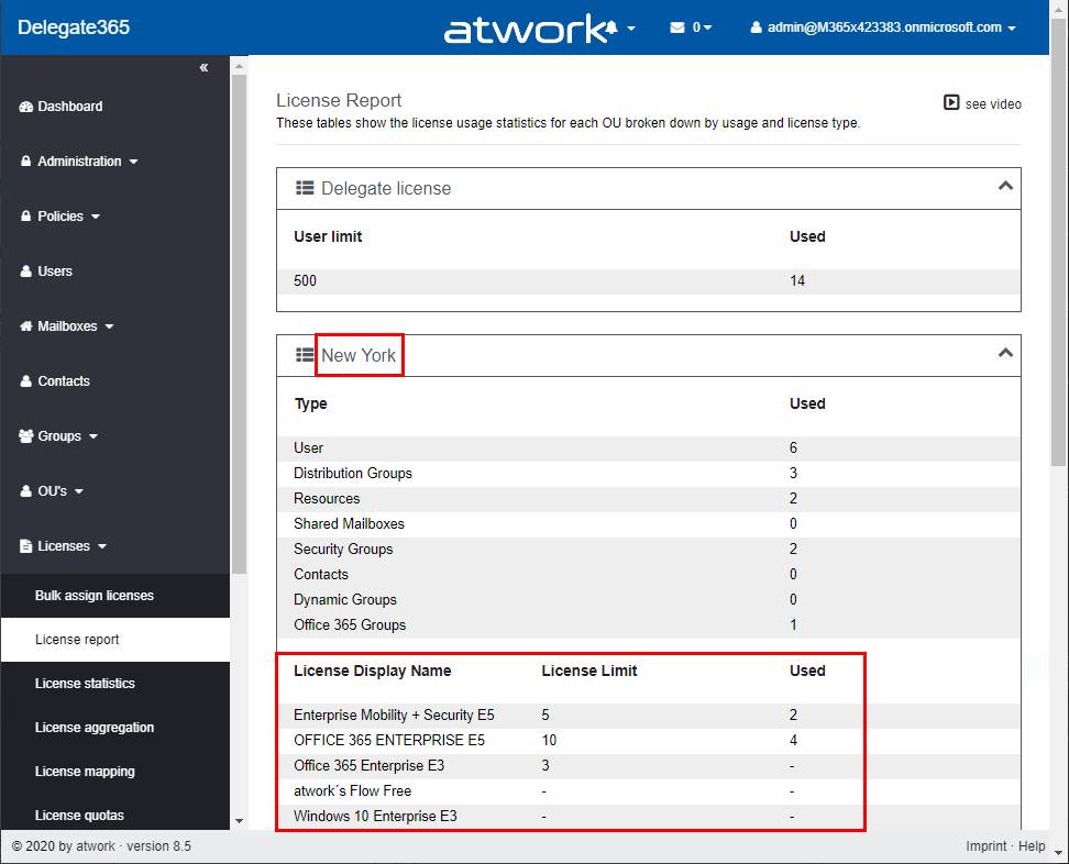 There are several ways to get the number of assigned Microsoft 365 licenses in Delegate365, depending on the administrator´s permissions policy and the OU assignments. See all methods listed here.