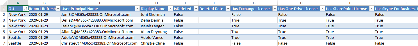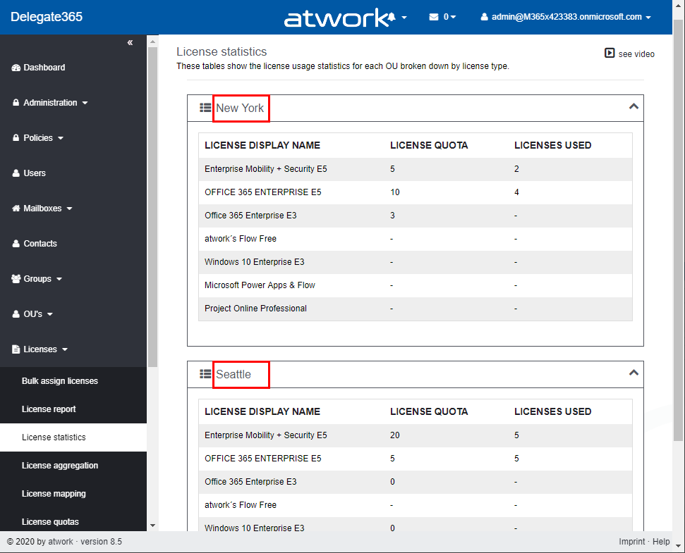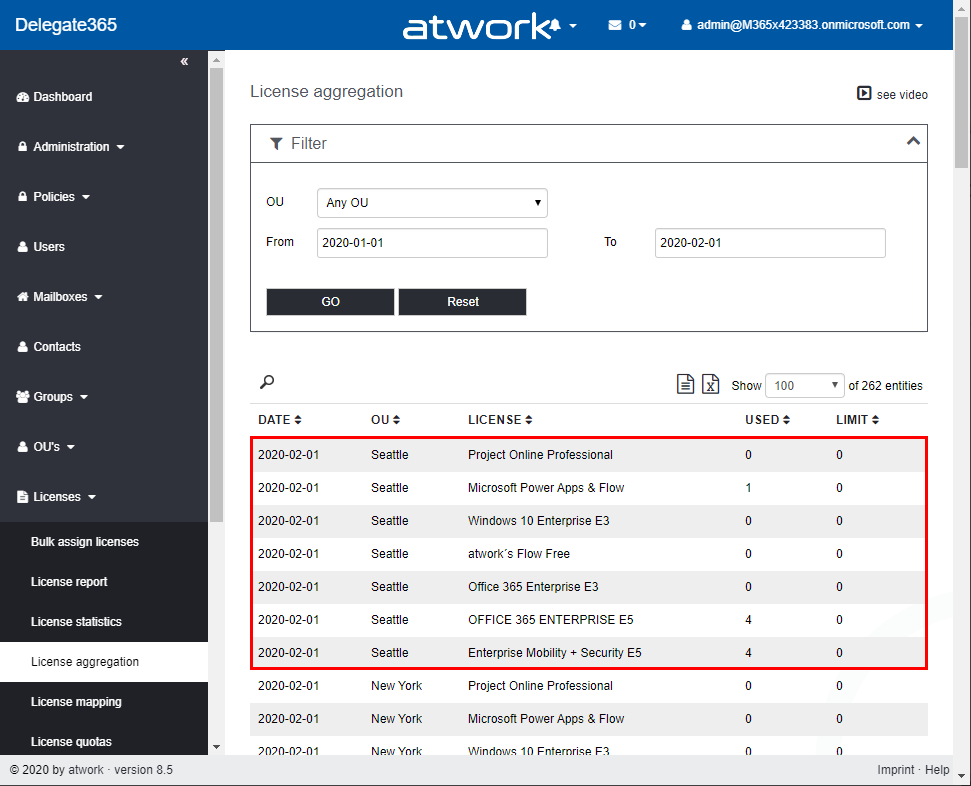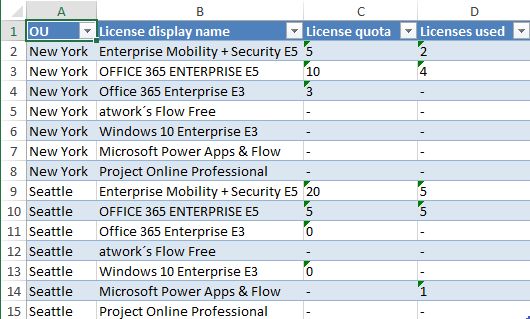 License statistics: This reports is an exported list including the current numbers of assigned licenses and quotas per OU as shown in the Excel export here.