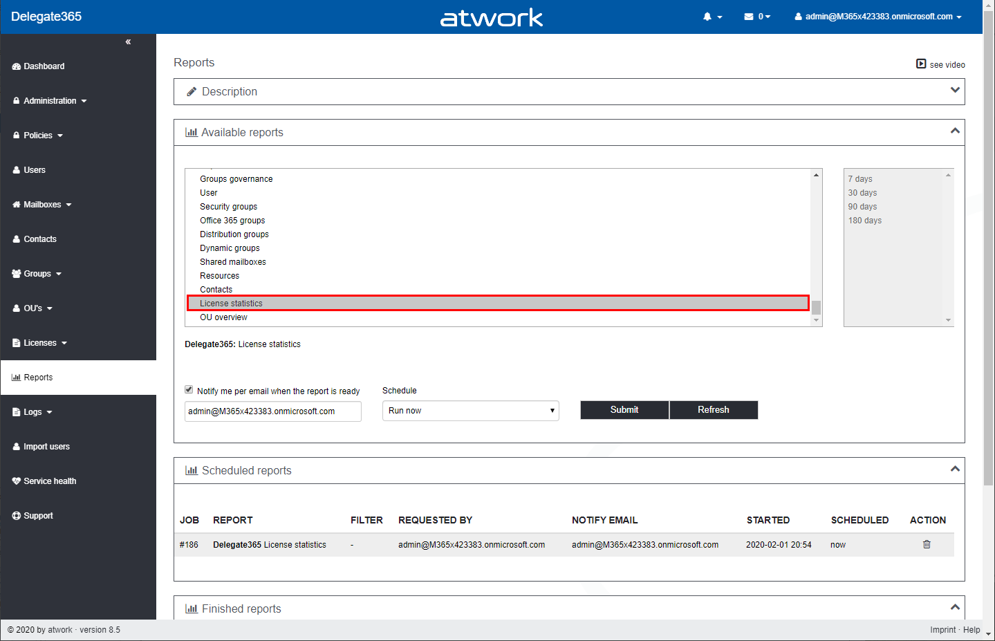 Note: In this chronicle you can go back to the beginning where you started working with Delegate365, not only 30 or 90 days as Microsoft 365 stores data! - Reports / Delegate365: The report License statistics in the Delegate365 section at the end of the report´s list shows the numbers of assigned Microsoft 365 licenses as well.
