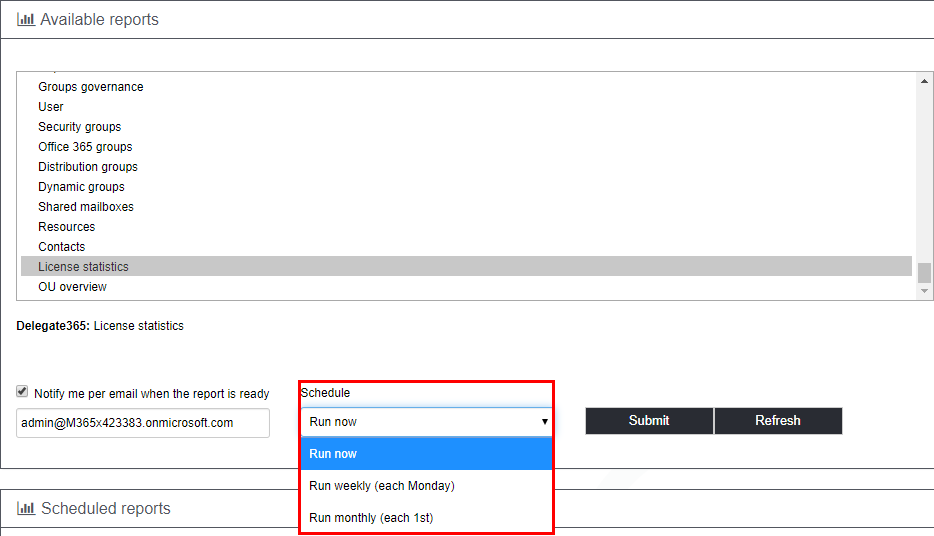 Note: To see a list of available reports with samples, see Delegate365 on GitHub - Reports / Delegate365 / notifications: Note that every admin can choose when to receive a report in the Schedule dropdown. Available options are* Run now, Run weekly (each Monday) *and Run monthly (each 1st). This allows to automate the report generation on a individual user basis.