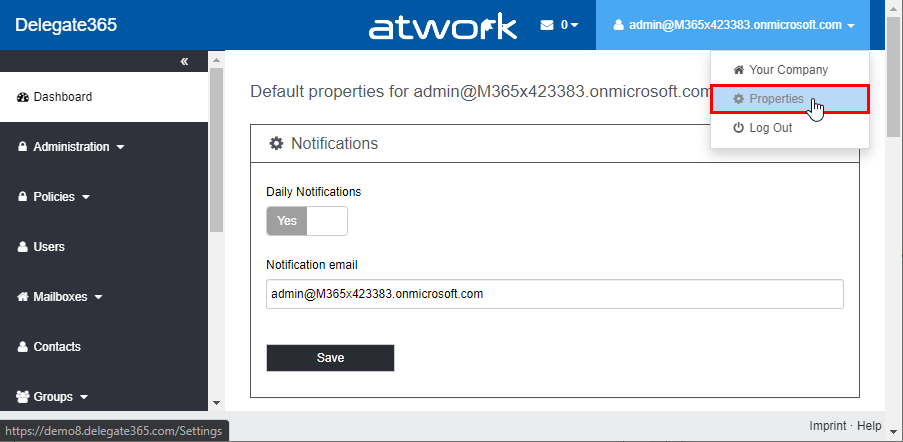 Note: The Portal admins controls how the notification is sent to the users: Send notification with link to the Delegate365 reports page, Send notification with the report as attachment, and Send a notification with a direct download link to the report, which is valid for 24 hours. Our recommend method is to use the last option with the 24-hours link. See more at Delegate365 changelog version 8.4 - New Report notification settings. - User properties / Notifications: Another option is to set the Daily Notifications to Yes in the user properties. Click on your user name in the top right corner and select Properties. Turn on the daily notifications and enter the email address to send the report to (usually that would be your work account address you use to manage Delegate365). Then, click Save.