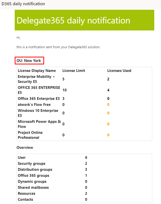 This notification includes a section for every OU showing the current numbers of assigned Microsoft 365 licenses and managed objects on a daily basis automatically. Every admin can select this option if needed.