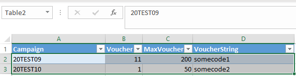 We access the following Excel table stored in a team. We need to find the corresponding campaign and read the voucher numbers and some more details to find out what´s the next voucher number and how many vouchers are still available to generate a new voucher or to deliver an appropriate status later.