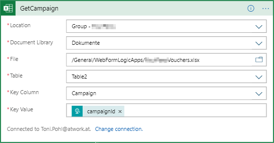 We get the data with the Excel connector in the action “Get rows” and read data from *Table2 *as here. Note: The data MUST be formatted as an Excel table. We rename the action to “GetCampaign”. As Key Column, we search for column A, Campaign. As Key Value, we pass the data “campaignid” @{triggerBody()?[‘campaignId’]} from the HTTP request as filter.