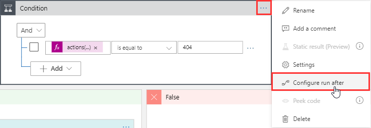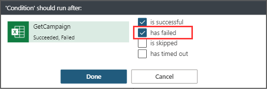 If no row (campaign) was found, the flow would break. So, we need to modify that behavior. We can change that in the IF condition after the GetCampaign action in the settings of the action by clicking on the “…” icon and “Configure run after”.