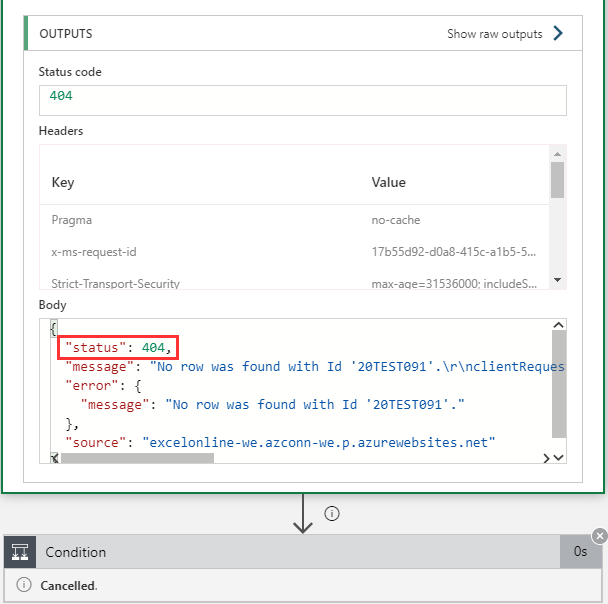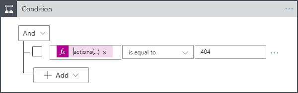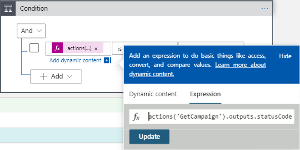 So our condition is as follows: @actions(‘GetCampaign’).outputs.statusCode equals 404