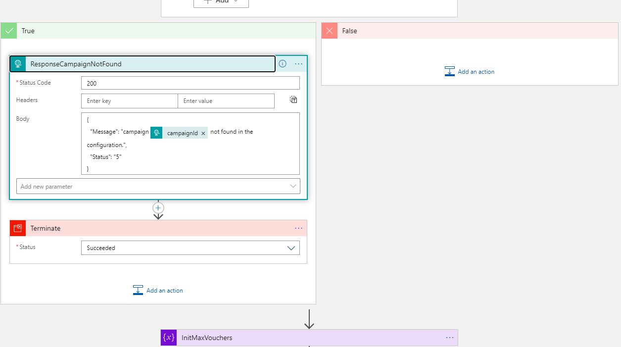 At the end, wen want to inform the caller in that case that the operation needs to be aborted. If the action was 404, not found, we send an error code and terminate the app. Otherwise, the Logic App shall continue to do what it´s supposed to do. This happens with the actions after the condition.