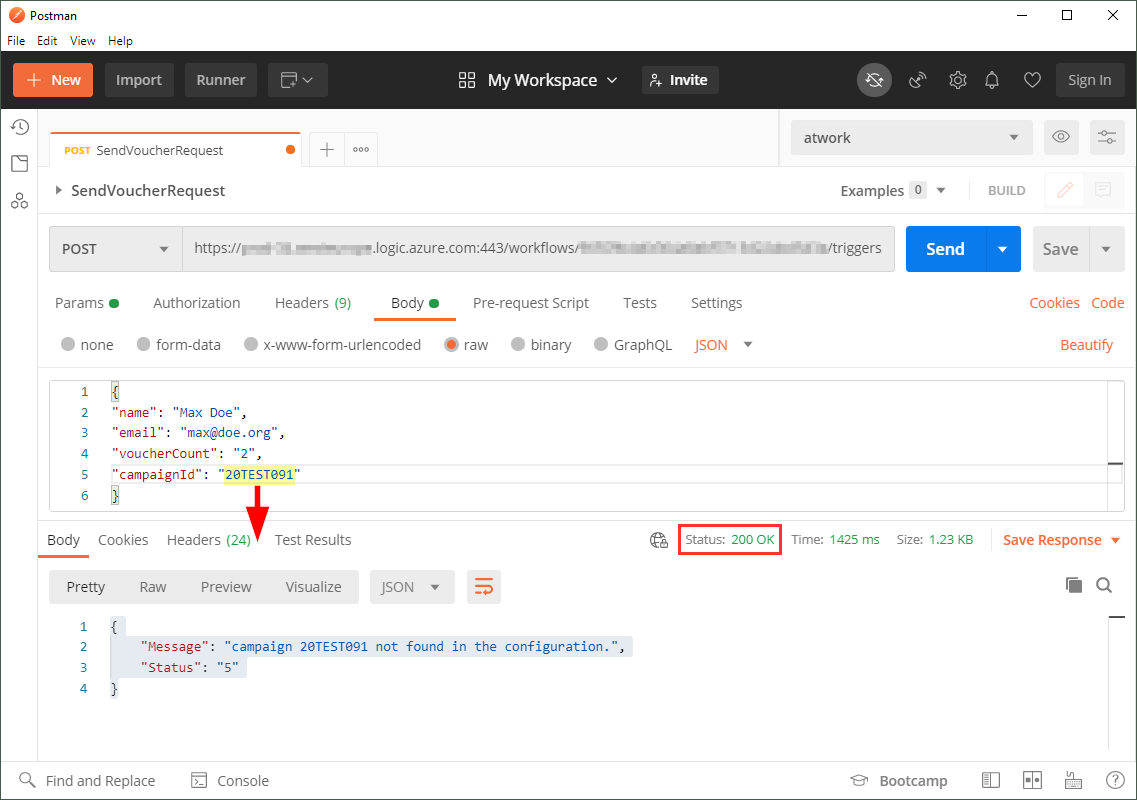 To test the Logic App, Postman helps. We send a non-existing campaignid to the Logic App.