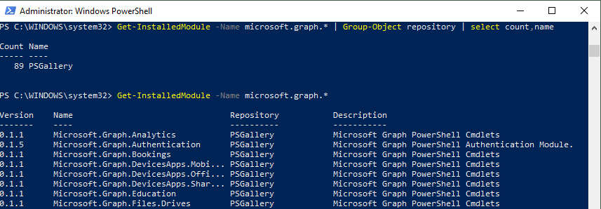 You will see a list of available (currently 89) modules, their version and their resource description. The current version number is 0.1.1 (only Microsoft.Graph.Authentication is 0.1.5). The single modules are by default stored as PS-libraries in C:\Program Files\WindowsPowerShell\Modules.
