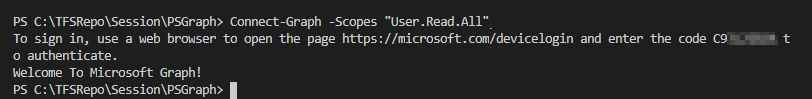 A text says to open a browser and do a device login using the generated authentication code, such as “To sign in, use a web browser to open the page https://microsoft.com/devicelogin and enter the code AB12… to authenticate.”. Then, sign-in with a work account of the tenant. After the successful operation, the module responds “Welcome To Microsoft Graph!”. It´s nice that the session is