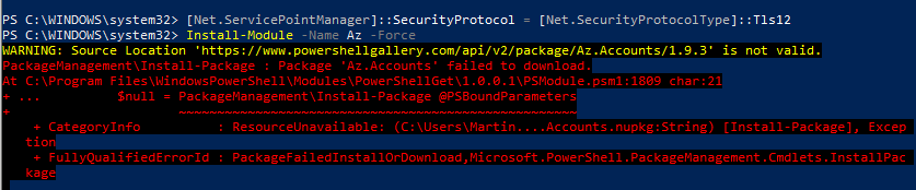 WARNING: Source Location 'https://www.powershellgallery.com/api/v2/package/Az.Accounts/1.9.3' is not valid. PackageManagement\Install-Package : Package 'Az.Accounts' failed to download.