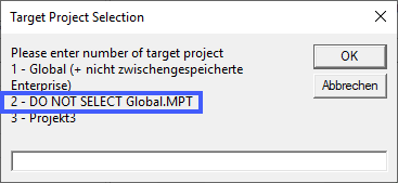 Wenn eine Aktualisierung von Modulen durchgeführt werden soll, darf der untenstehende Code nicht im Zielprojekt liegen. Die Liste der möglichen Zielprojekte enthält in diesem Fall einen Hinweis.