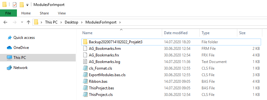 After spending years of exporting modules for back-up purposes and importing new or modified modules with right mouse clicks, I wrote code some time ago, which I use to automate this. I have modified the code a bit now, since UserForms cannot be provided as plain text. Code that gives the choice to: