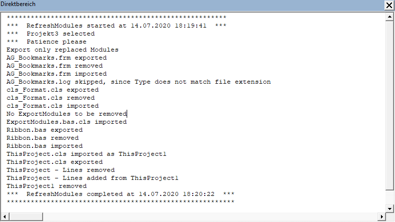 Nachdem ich jahrelang Zeit verbraucht habe, mit rechten Mausklicks Module für BackUp-Zwecke zu exportieren und neue oder geänderte Module zu importieren, habe ich vor einiger Zeit Code geschrieben, womit ich das automatisiere. Ich habe den Code jetzt etwas abgewandelt, da UserForms nicht als Plaintext bereitgestellt werden können. Code bietet die Auswahlmöglichkeit.