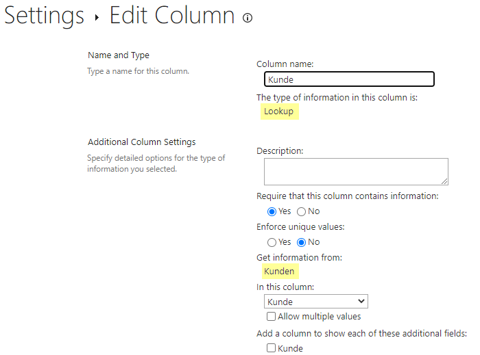 Often, lookup data is used in SharePoint custom lists to retrieve a predefined set of data. Such a field is usually populated with data from another SharePoint list. The list definition in SPO looks as here. In this sample, the dropdown column name is “Kunde” which is German for “customer” and there´s another list named “Kunden” holding the data.